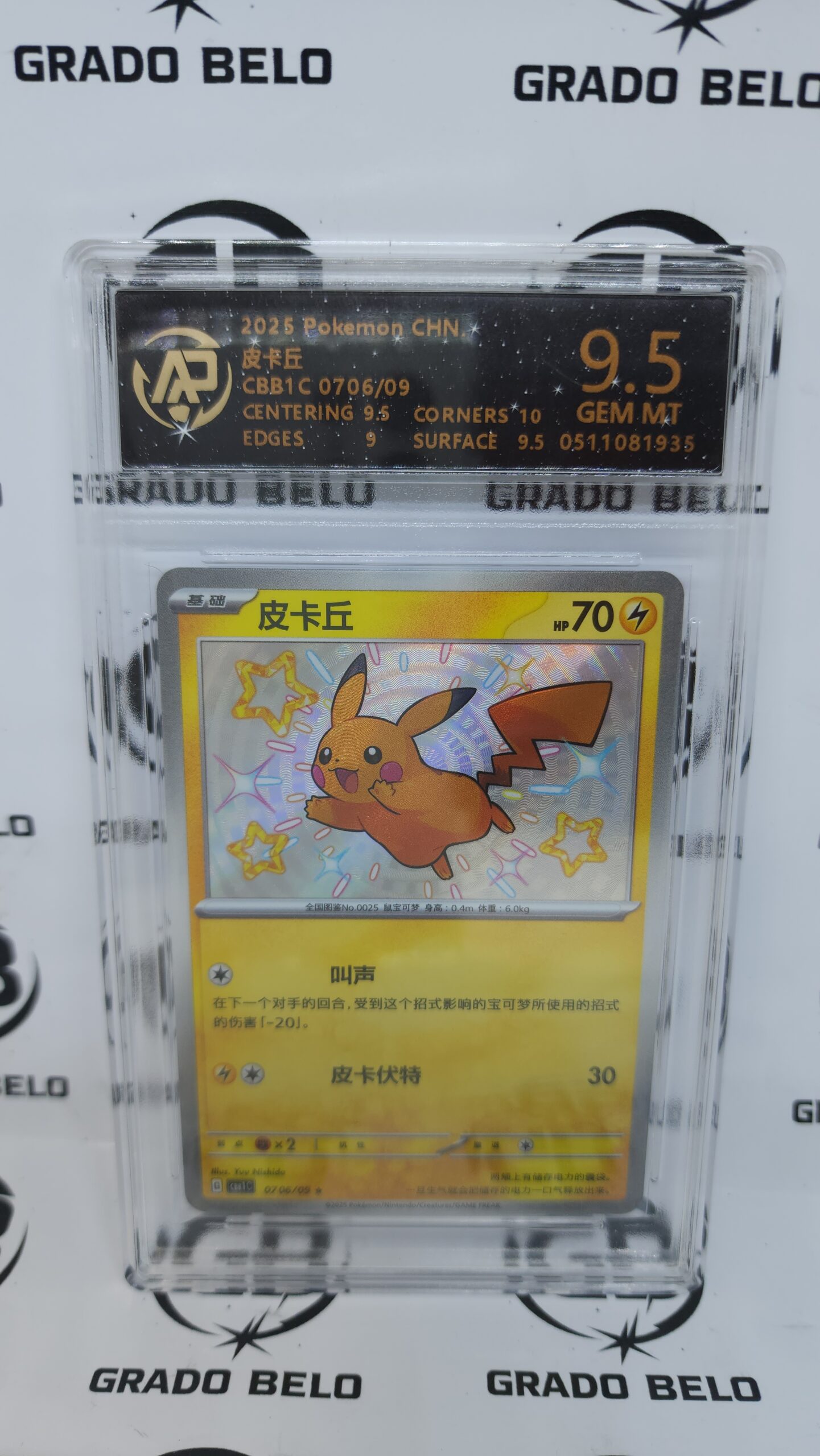 ¡La chispa que toda colección necesita! Presentamos este adorable Pikachu de la serie Horizontes Pokémon, una de las cartas más buscadas por su arte vibrante y su conexión con la nueva era del anime. En su edición para el mercado chino, esta pieza destaca por una nitidez de impresión superior, alcanzando el prestigioso grado GEM MINT 9.5. Con el respaldo de Grado Belo, esta carta se posiciona como una pieza de colección impecable y una inversión segura en el tiempo.